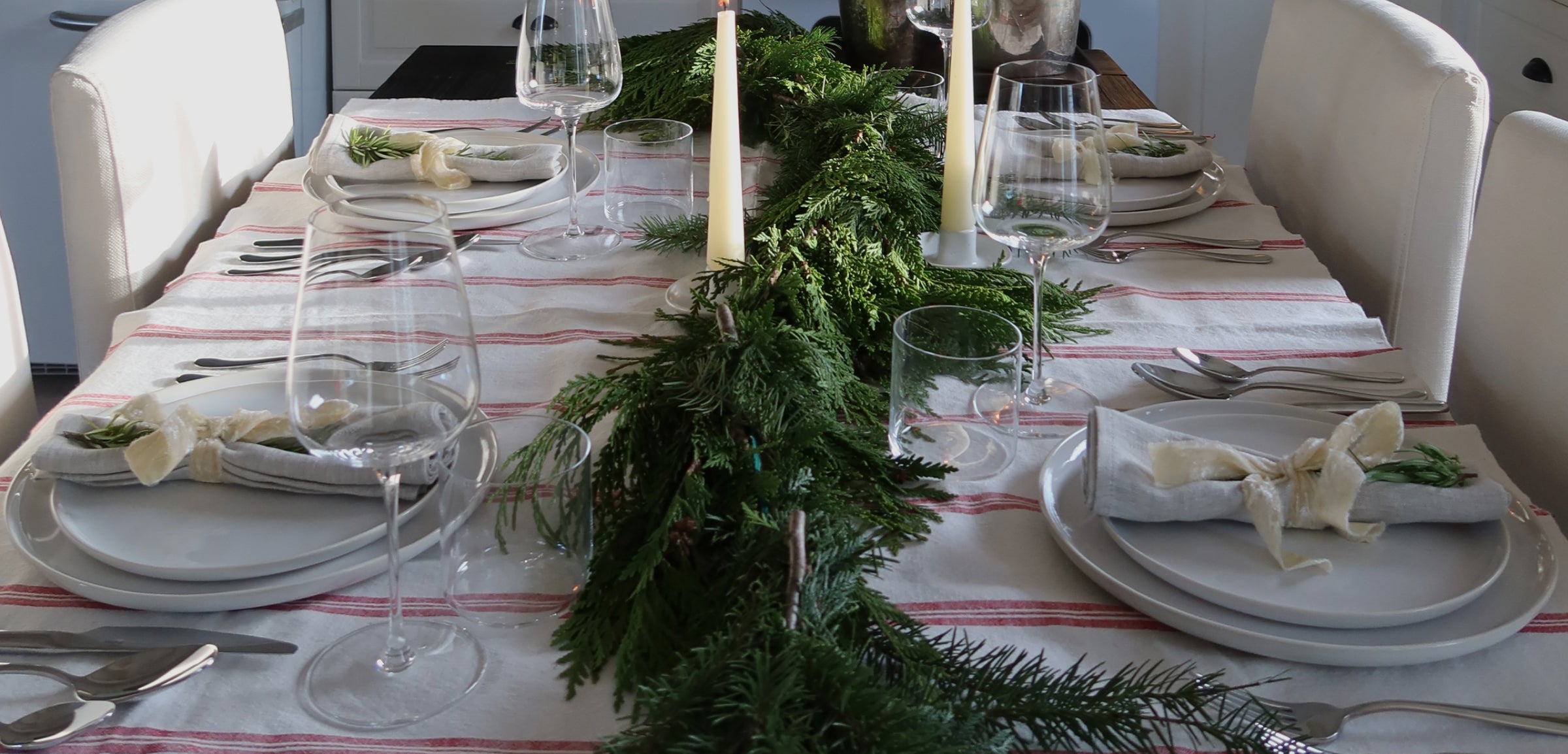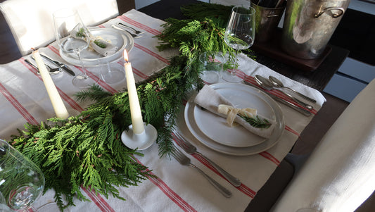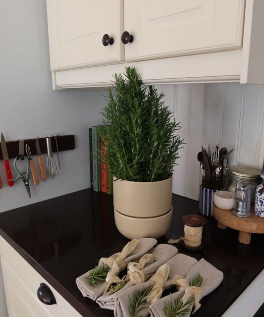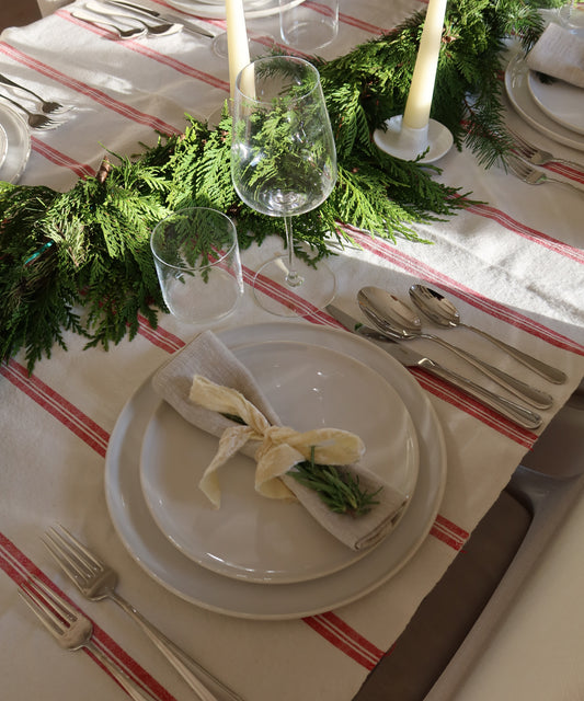 “My recipe for holiday hosting: timeless flatware, hand-finished dinnerware, sleek glassware, and fresh rosemary in ceramic planters—all styled to create a warm, elevated table.”